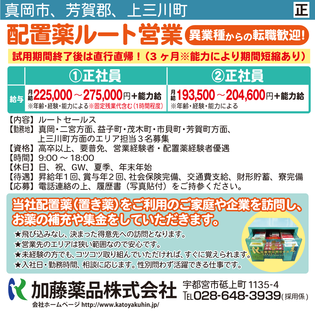 | 2025/12/05 | 真岡市、芳賀郡、上三川町 | 薬品販売 | 配置薬のルートセールス | 9:00~18:00 | 正 |