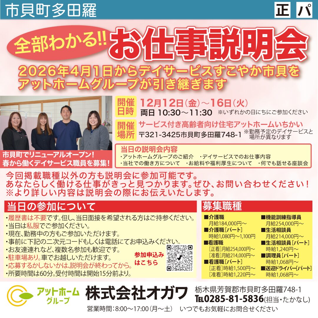 | 2025/12/05 | 市貝町多田羅 | 医療介護 | 介護職員・看護師・生活相談員・調理員・送迎ドライバー など | 説明会にて、職種による | 正/パ |