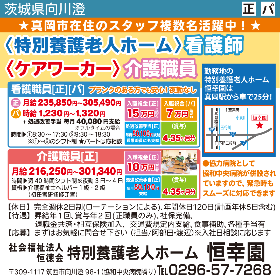 | 2025/12/05 | 茨城県向川澄 | 医療・介護 | ①看護師②介護職員 | ①⑴8:30~17:30⑵9:30~18:30②シフト制 | 正/パ |