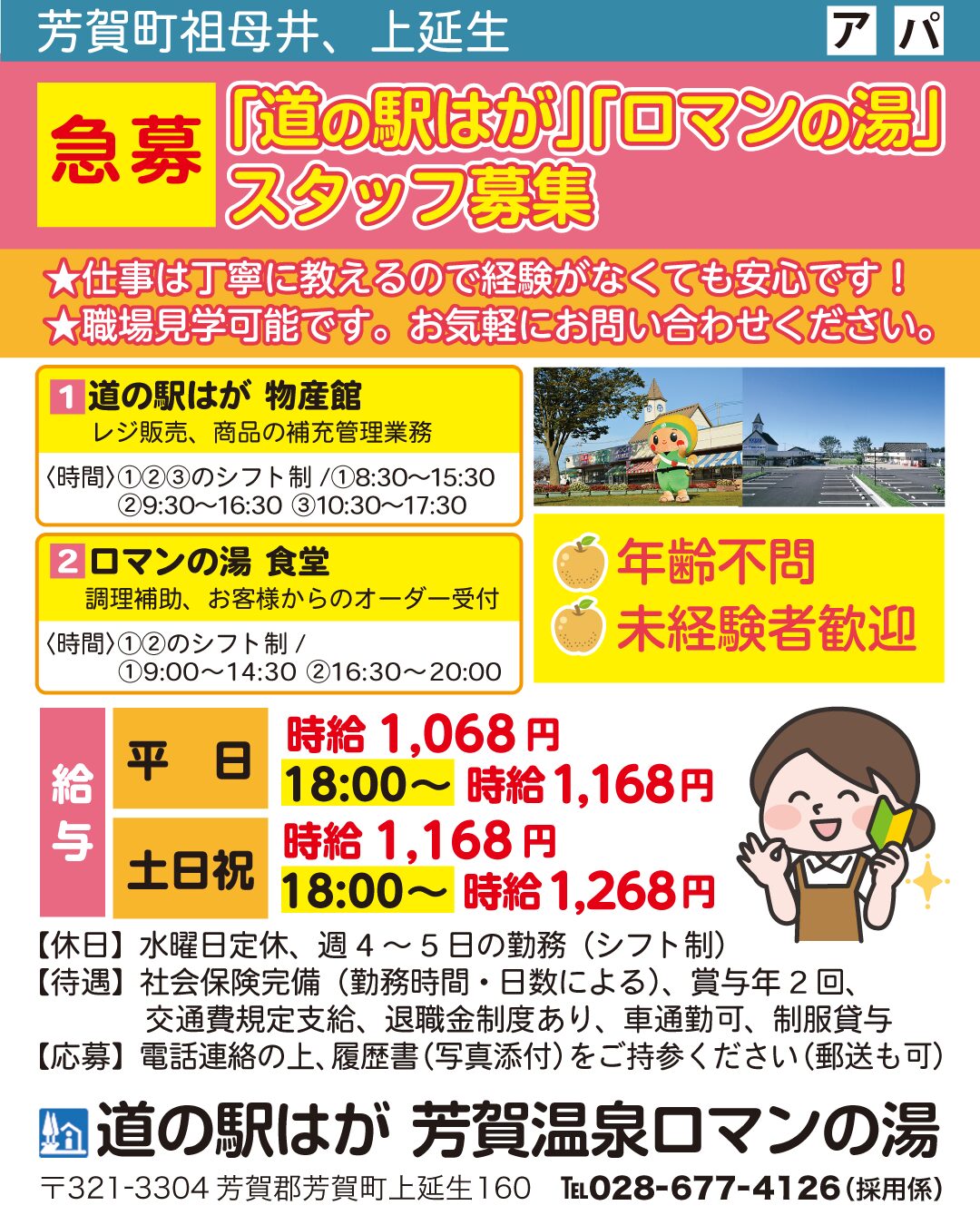 | 2026/04/03 | 芳賀町祖母井、上延生 | サービス業、飲食業 | 物産館スタッフ、食堂スタッフ | シフト制 | ア/パ |