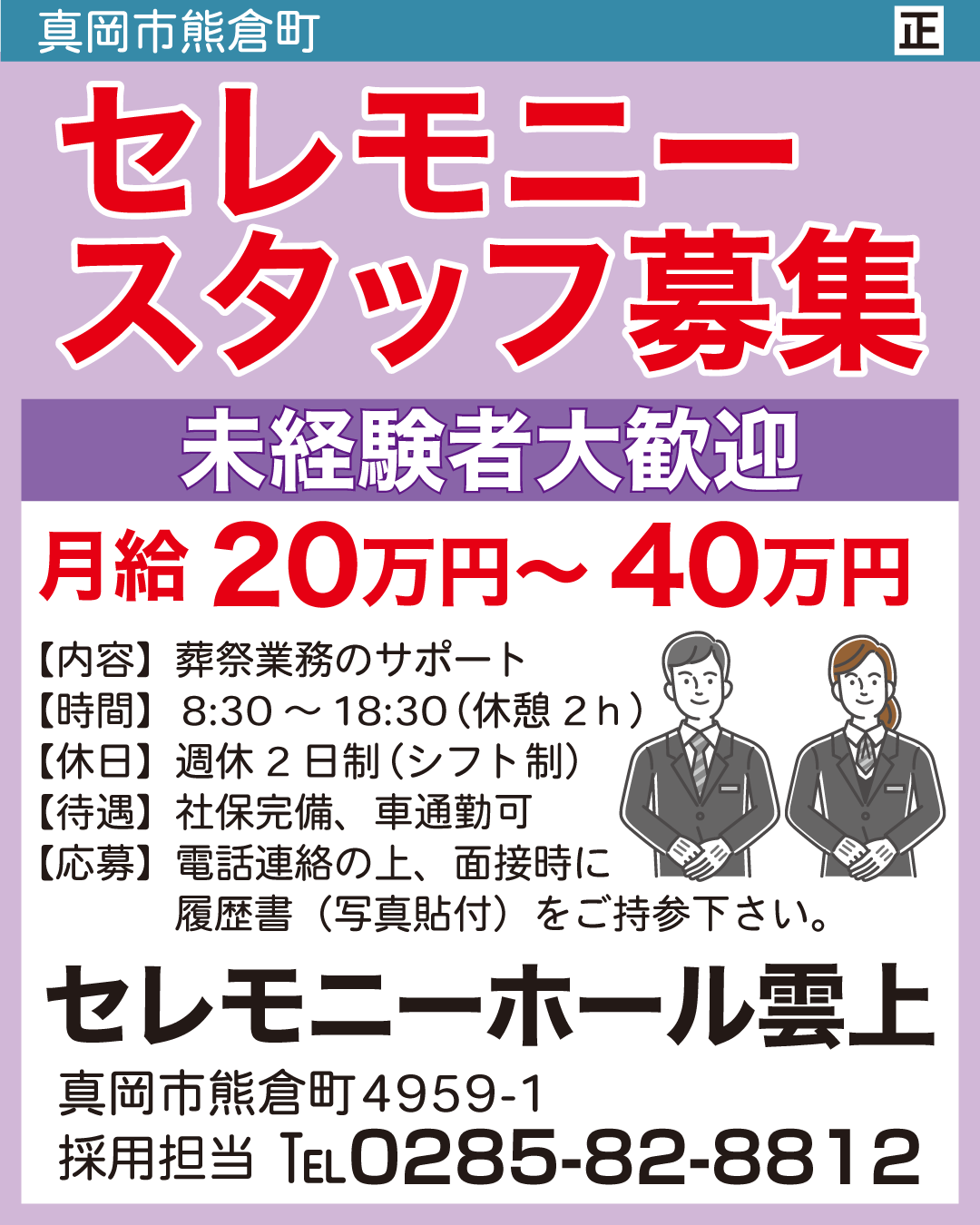 | 2026/04/03 | 真岡市熊倉町 | サービス業 | セレモニースタッフ | 8:30~18:30 | 正 |