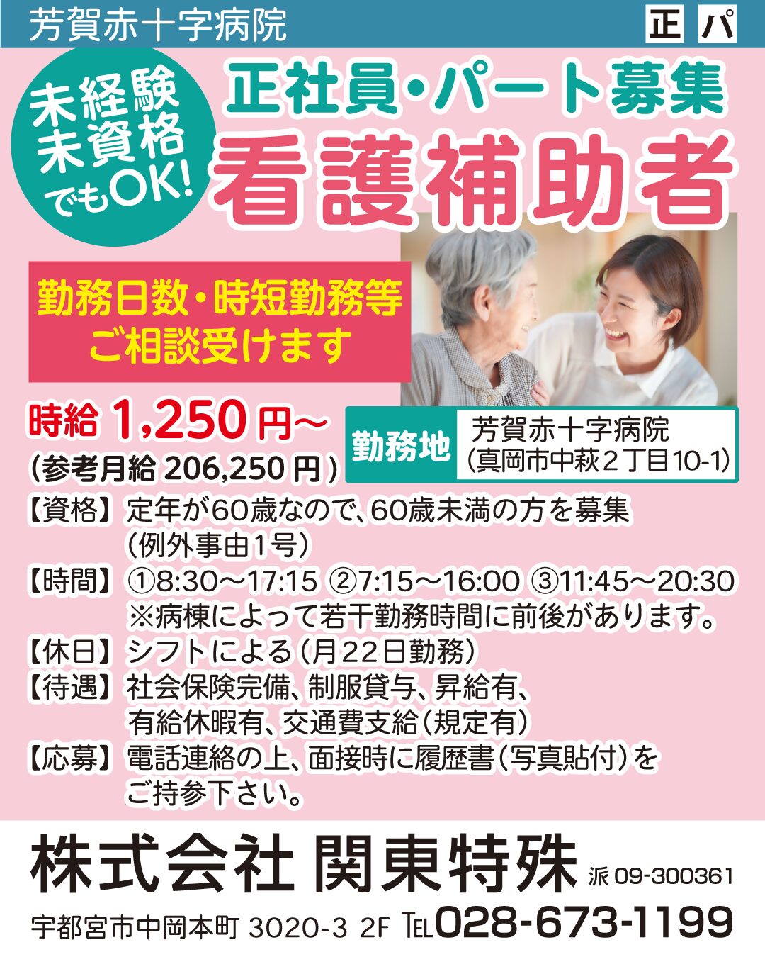 | 2026/04/17 | 益子町塙 | 医療・介護・調理師 | ①看護補助[パ]②管理栄養士[正] | ①8:15~17:15の間で5H以上②8:15~17:15・16:30~翌9:00 | 正/パ |